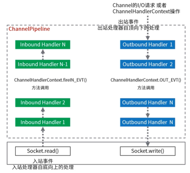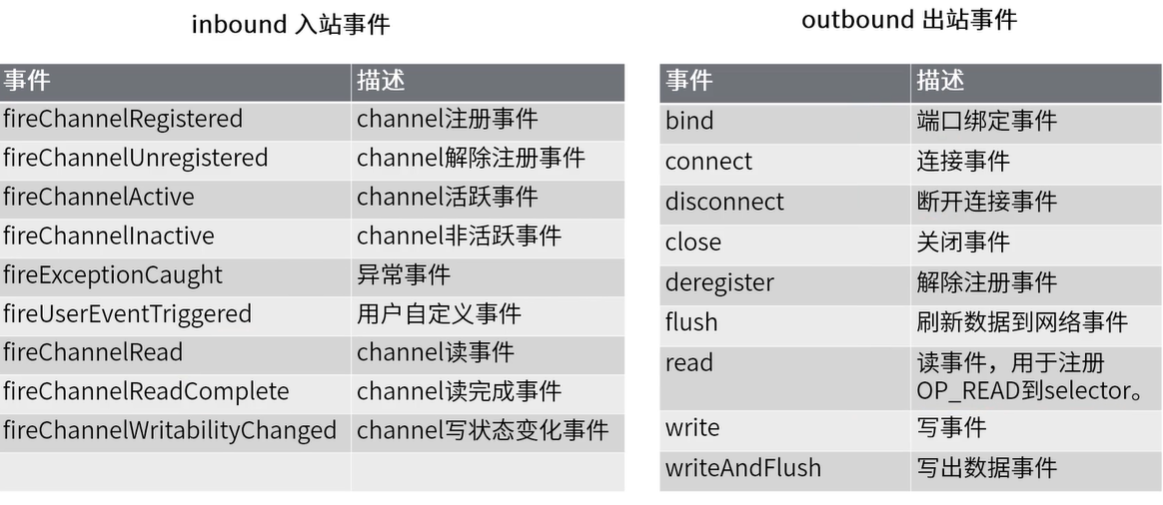 出站事件:通常指 IO 线程执行实际的输出操作(通俗理解:想主动往 socket 底层操作的事件的都是出站)。